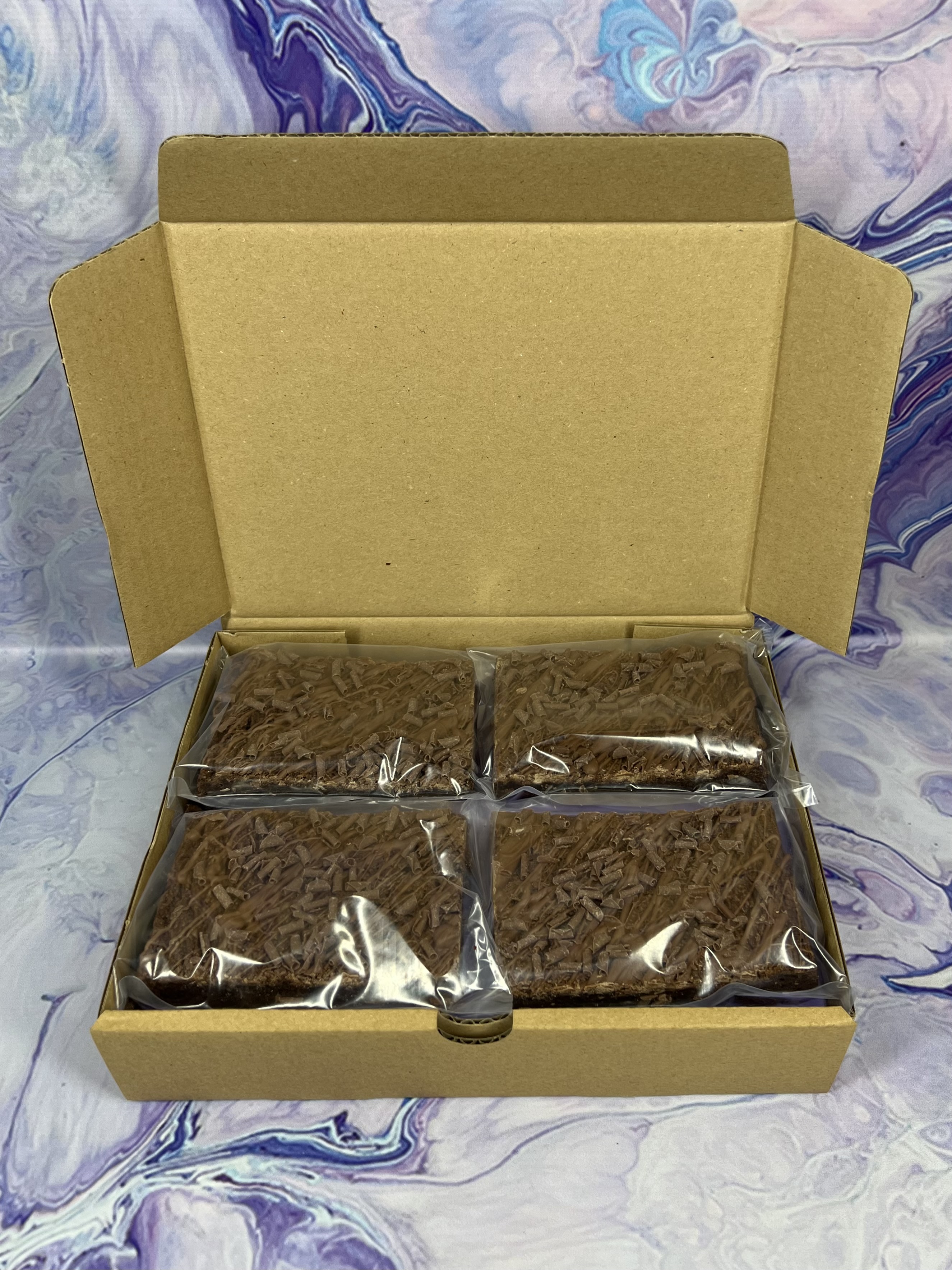 You will receive four (10 cm by 7.5 cm approx each) Milk Chocolate Brownies.