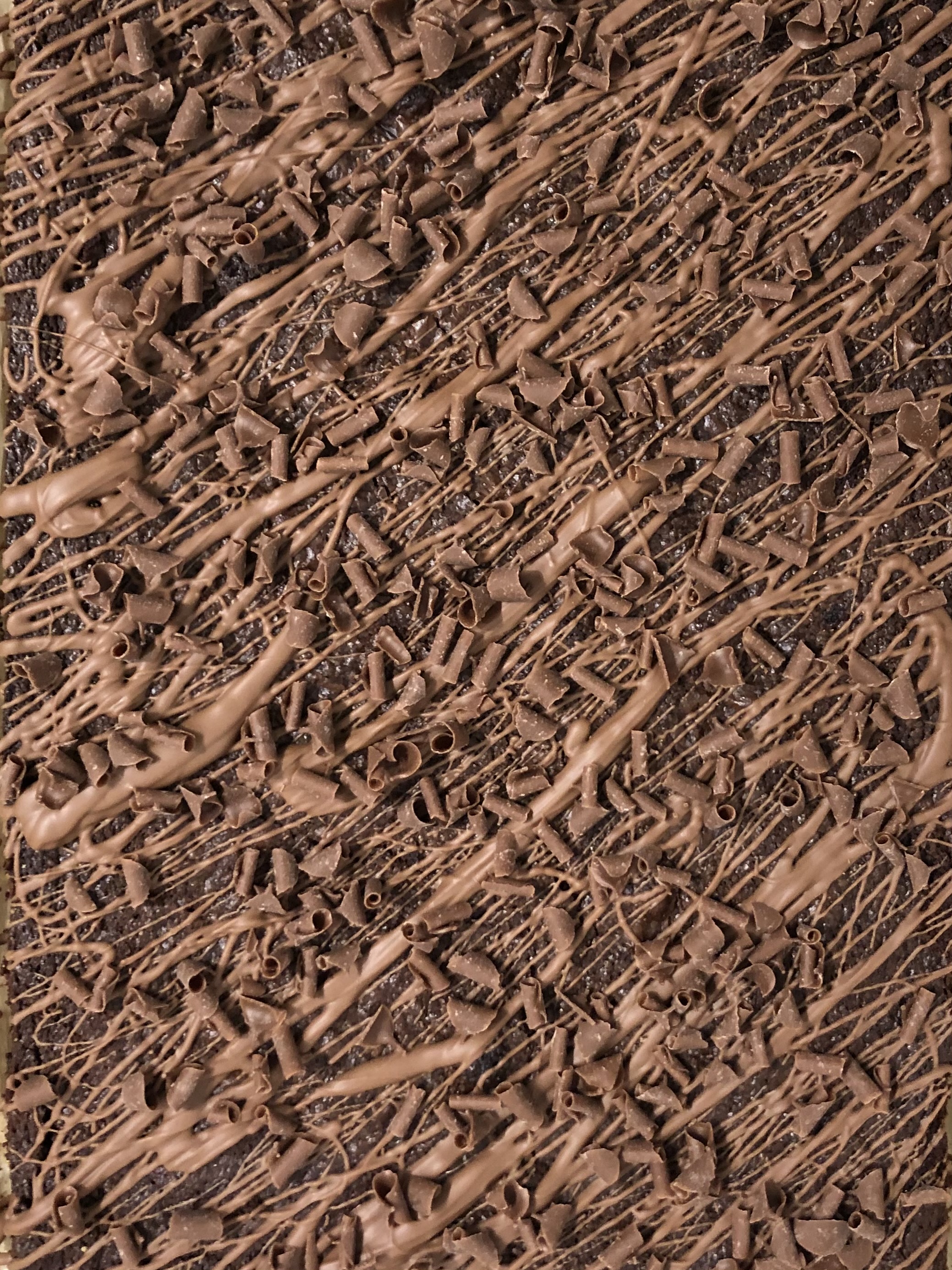 Indulgently rich Belgium chocolate brownie topped with milk chocolate drizzle and chocolate curls.
